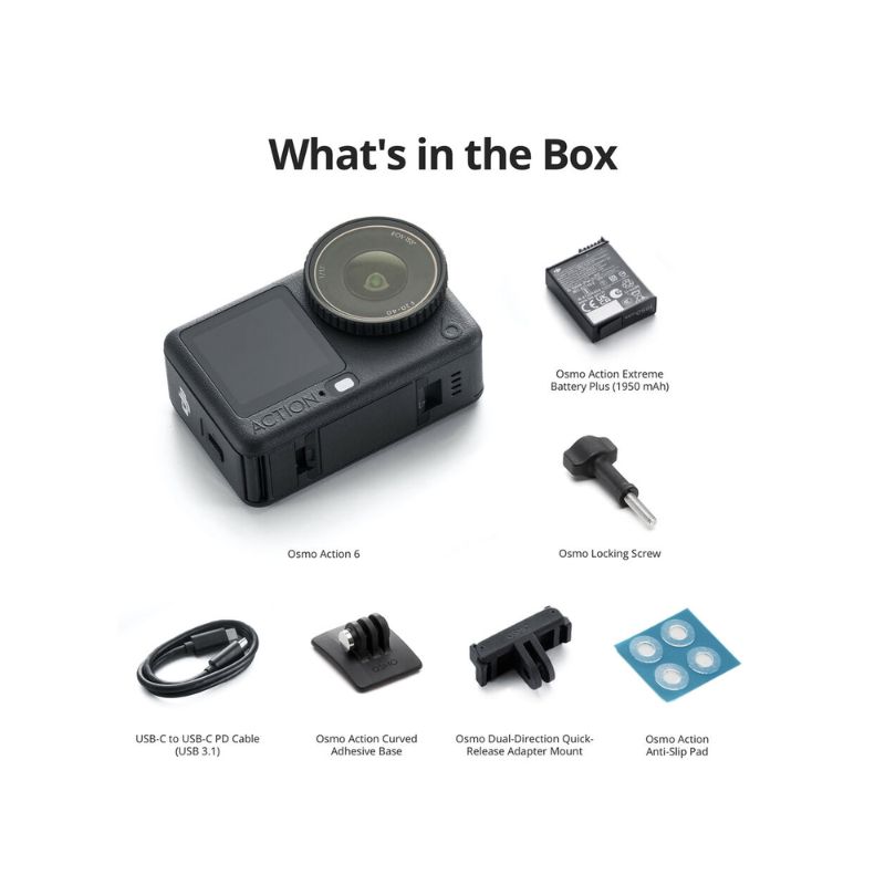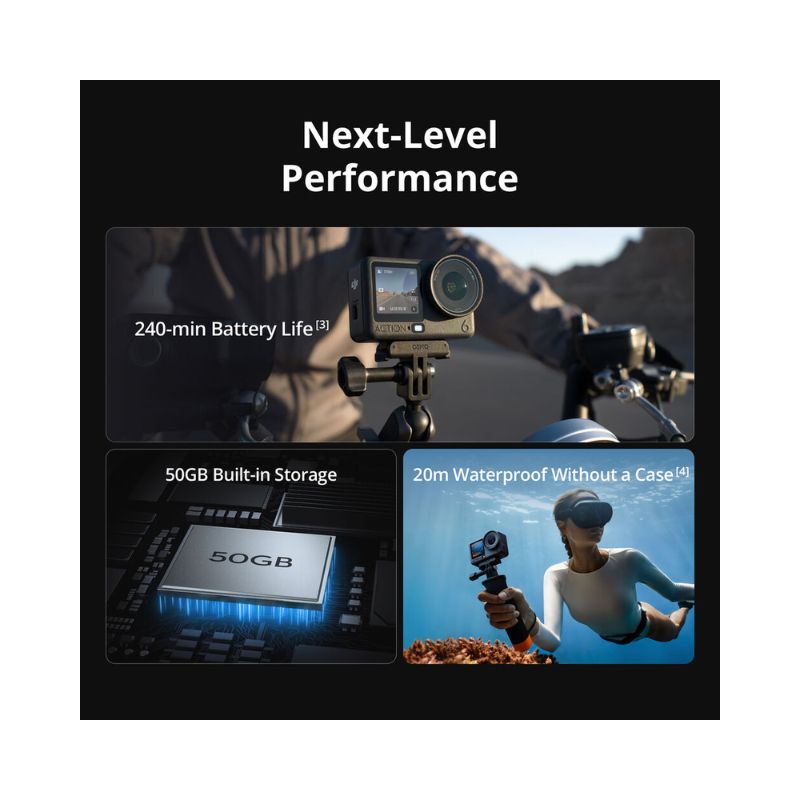 Capture steady, pristine video footage in up to 4K120 resolution wherever you are with the Osmo Action 6 Standard Combo from DJI. The Osmo Action 6 features a new 1/1.1″ square sensor, Starburst mode, a variable f/2 to f/4 aperture, and it now has 50GB of internal storage, and it is more cold resistant. It maintains its high-bright dual OLED screens, RockSteady and HorizonSteady stabilization systems, a 38MP sensor, a 4-hour battery life, and a waterproof camera body with a water pressure gauge. Other features include 8K stills, subject centering/tracking, OsmoAudio support, raw footage capture, a 155° field of view, and an SD card slot that supports up to 1TB cards.
