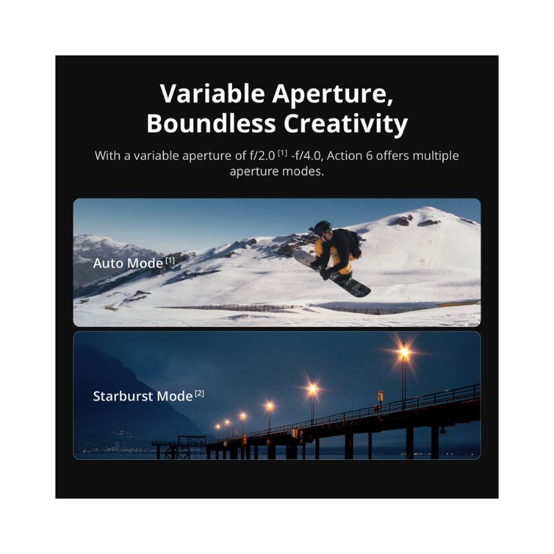 The Osmo Action 6 is DJI’s first action camera with a variable aperture of f/2 to f/4, breaking away from the traditional fixed‑aperture design. The aperture adjusts manually or automatically within each range to achieve clear and balanced results, from low-light night shots to detailed landscapes.