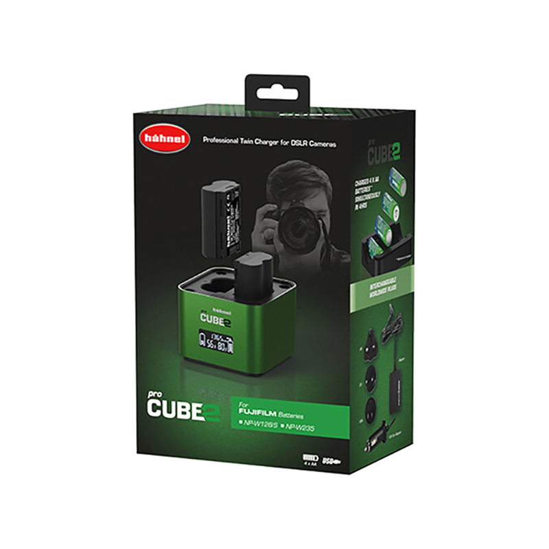 The Professional Charger PROCUBE2 f from hahnel is a two-bay charger that is compatible with select FUJIFILM and Panasonic batteries and can simultaneously charge up to two lithium-ion batteries within 50 minutes. An included charging plate, which sits atop the existing plate, charges four NiMH batteries as well.