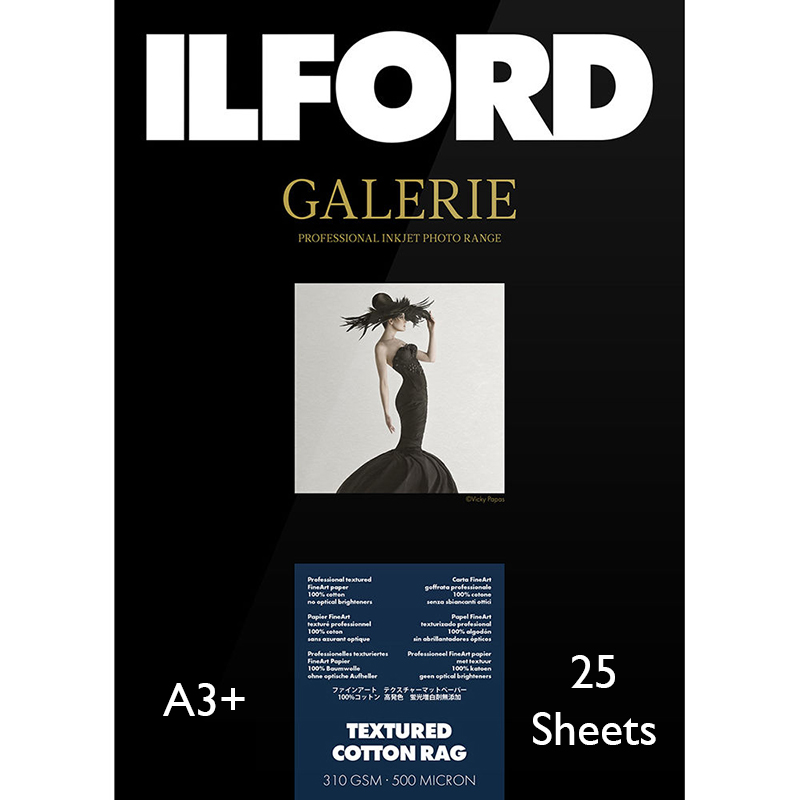 Create vibrant, long-lasting fine art prints with this 25-sheet pack of A3+ GALERIE Prestige Textured Cotton Rag Paper from Ilford. Fourdriner-made with a 100% cotton rag, it features a textured matte finish that will highlight your images. Also, it has a heavy weight of 310 gsm along with a thickness of 20 mil and an opacity of >98%. Additionally, it does not use any optical brightening agents for longevity and is water resistant.