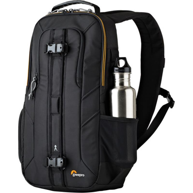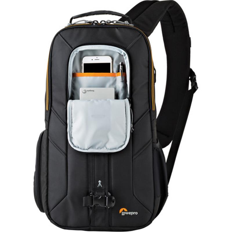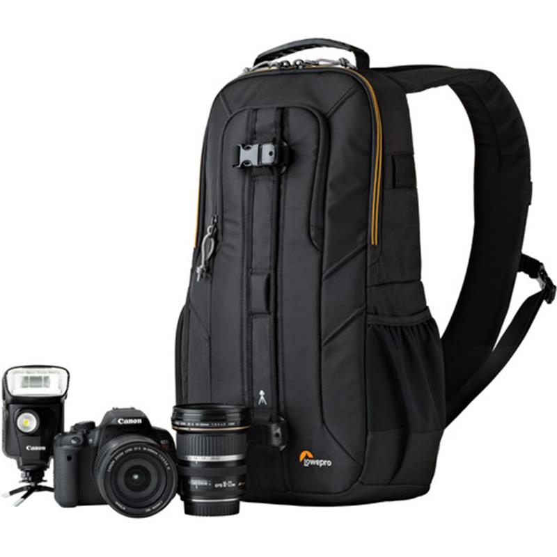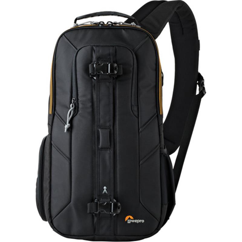 Carry your gear around the city for an afternoon or pack light for a day trip with the black Slingshot Edge 250 AW from Lowepro. Designed for urban environments or exotic travel adventures, this slim and secure sling can hold a compact dslr, two lenses, an external flash in the padded main compartment and a mini tablet in a zippered front pocket. Interior pockets and a fully adjustable padded divider system organize and protect your camera and lenses, while smaller accessories can be stored in the front pocket, and something like a water bottle can be carried in the exterior slip pocket. A small tripod or a rolled-up jacket can be secured to the front of the bag with the two removable straps with quick-release buckles. Dont miss a shot with the quick-access side pocket or through the dual-zipper top opening. The padded sling strap provides comfort for a day of shooting or touring, and the grab handle at the top allows for easy access when storing in an overhead bin or even at home when not in use. Constructed of 600D and 420D polyester, your sling backpack is both durable and strong and comes with a built-in all weather cover protecting gear from rain, snow, and dust as needed.