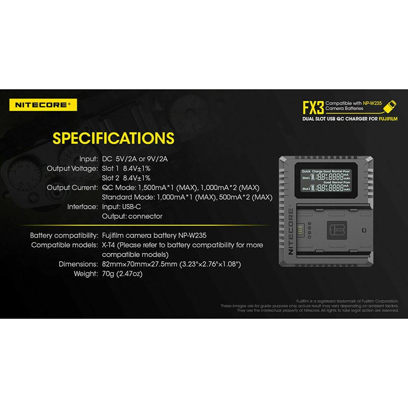 - DUAL SLOT CHARGER – FX3 simultaneously charges 2 batteries, QC capable. Compatible with Fujifilm X-T4 camera NP-W235 batteries.