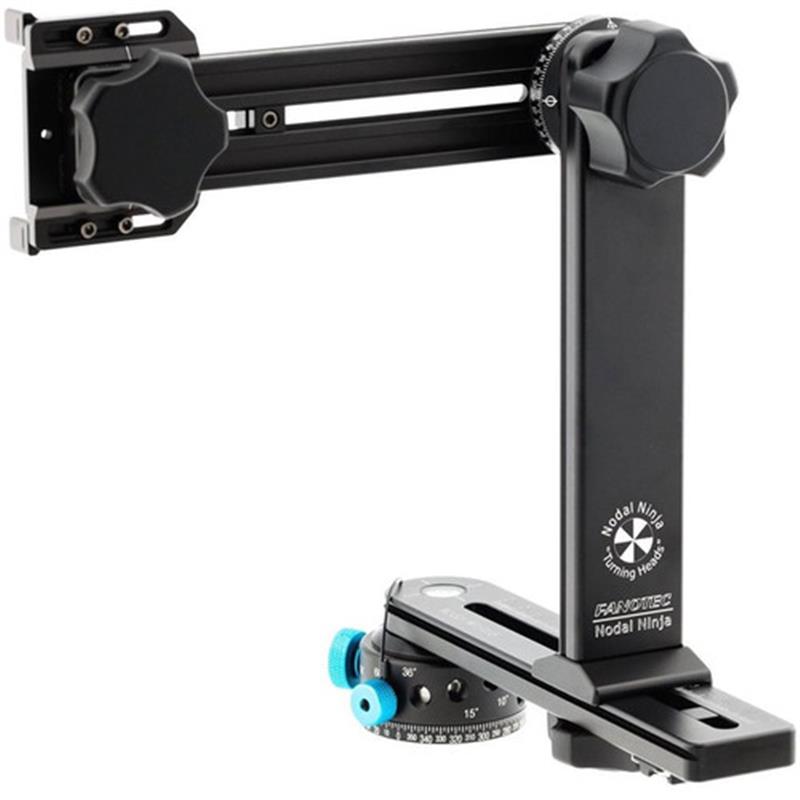 - Five main Nodal Ninja components, a horizontal rail, a vertical rail assembly with a tilting stage, an upright foot that connects the vertical rail assembly to the horizontal rail, a camera mounting plate, and an Advanced Rotator D10 rotary base that together, provides the ability to capture a sequence of images for creating single- or multi-row panoramas which are free of stitching artifacts