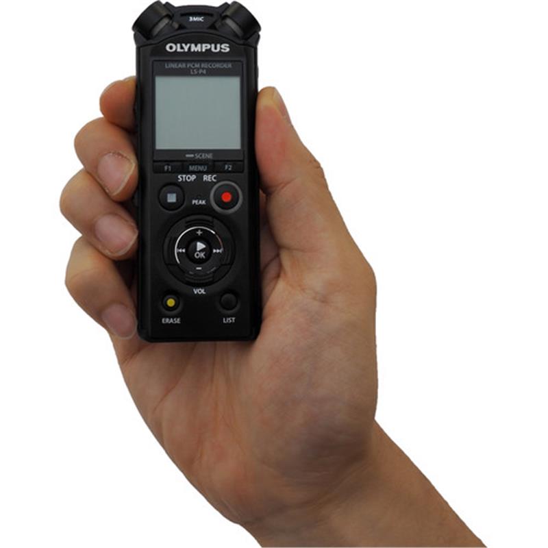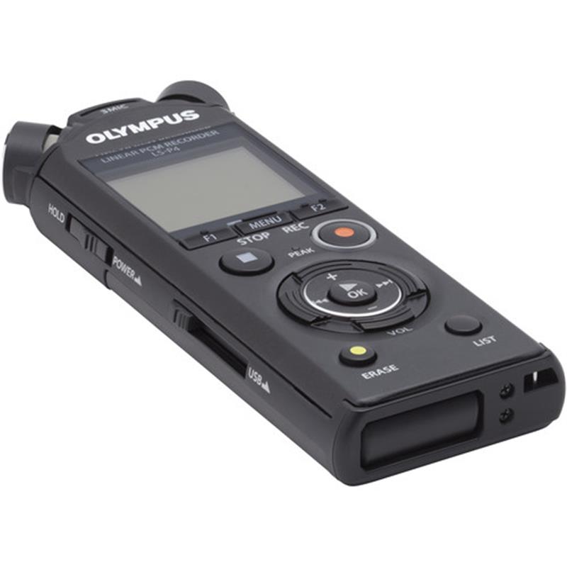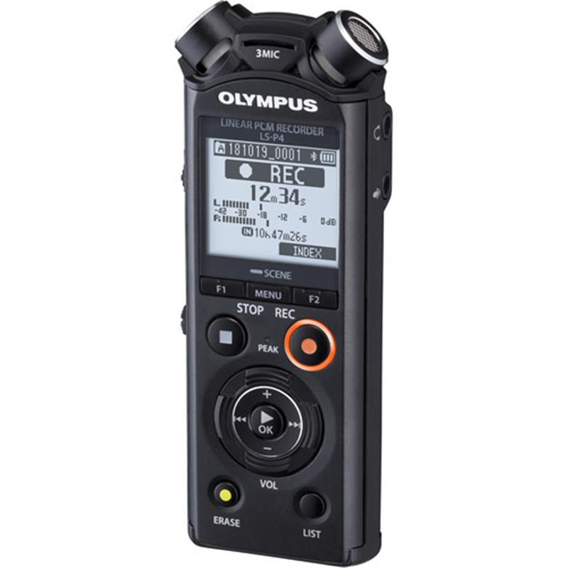 The LS-P4 Audio Recorder from Olympus features three microphones and is designed to mimic the function of human ears. It is equipped with two directional microphones to create a stereo effect with a third omnidirectional microphone that is positioned between the other two on the recorder. It can be used to capture an expanded frequency response of 20 Hz to 20 kHz when the center microphone is on, and 60 Hz to 20 kHz when it is off.The LS-P4 PCM recorder is compatible with FLAC format recordings that reduce high-resolution audio file sizes with no reduction in audio quality. Other features include compatibility with PCM/MP3 file formats, USB charging, built-in 8 GB file storage (which stores up to 253 hours of audio), a microSD external memory slot, and Bluetooth playback on compatible headphones. A rechargeable AAA NiMH battery is also included.