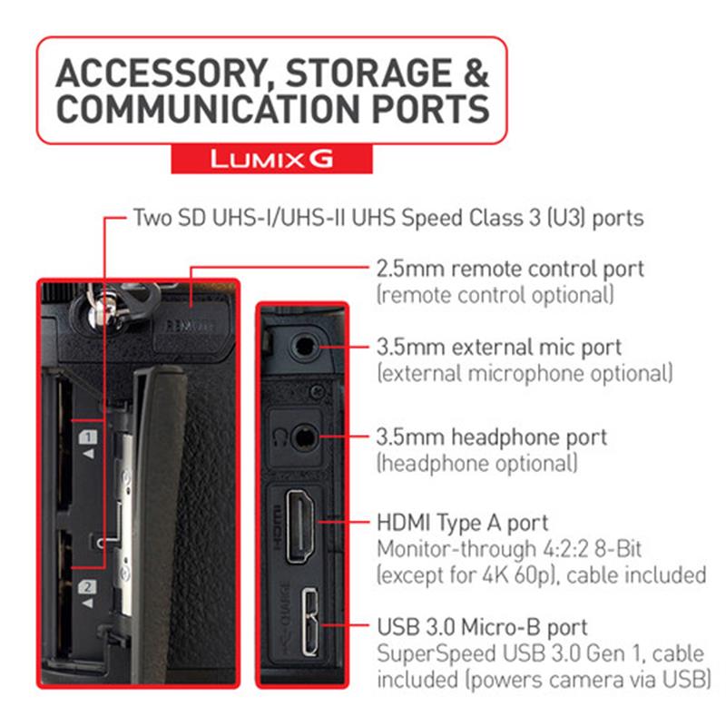 In order to maximize image quality, the G9 features a full-size HDMI output for using an optional external recorder to receive 10-bit 4:2:2 footage at all resolutions up to UHD 4K at 60p. Also, both a 3.5mm headphone jack and 3.5mm microphone input are available for improving audio capture.