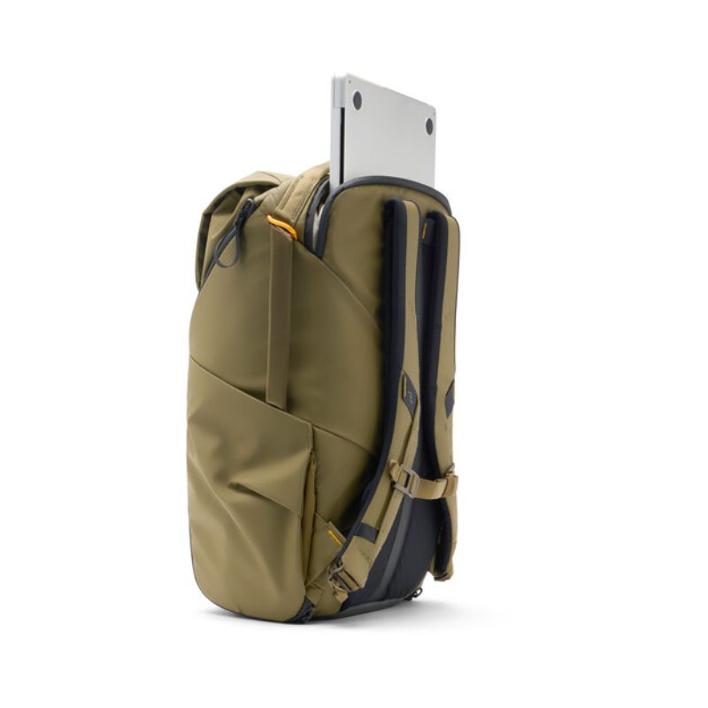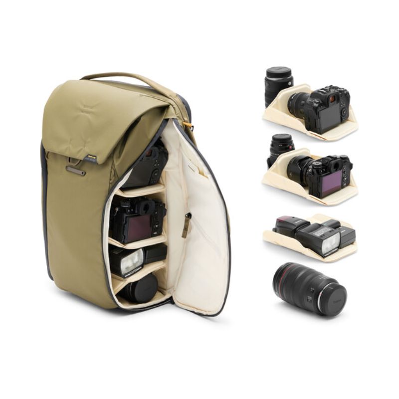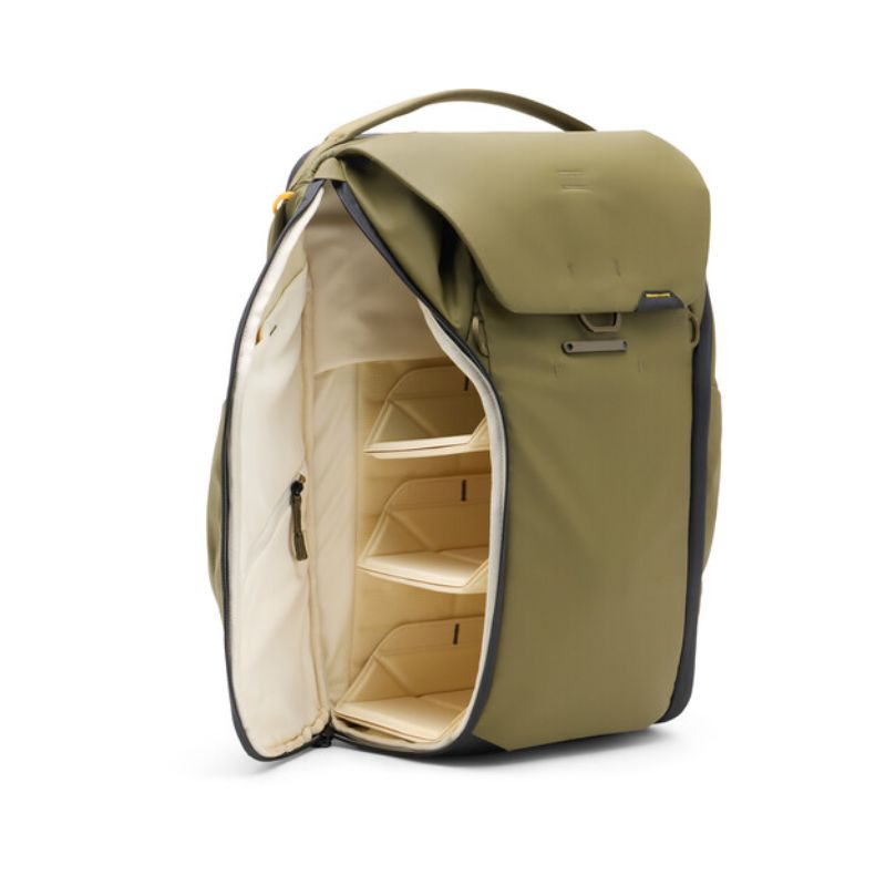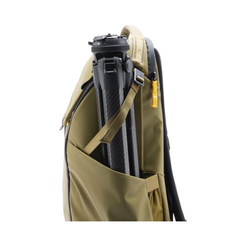 Carry your camera bag and other necessities with the 30L Everyday Backpack from Peak Design. This versatile bag is designed for photographers, multimedia creators, or anyone seeking a pack that is size adjustable and compressible. Multiple magnetic latches on the top flap allow you to adjust the height of the pack from 20.4 to 24.5″. The interior has three dividers so you can stack items in the main compartment. The dividers have foldout surfaces that can be configured to cushion and hold items against the pack’s zippered side openings. The side openings are positioned to face you when the bag is rotated from back to front with either side facing upward. The dividers allow you to choose which items are most quickly accessed from the sides.
