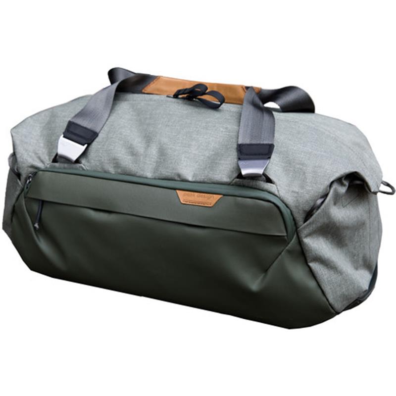 The Travel Duffel 35L in Sage from Peak Design is a duffel-style bag with an ID card holder that has a top made from 100% recycled 400D nylon canvas and a 900D ottoman-weave polyester fabric bottom. The long oversized #10 weatherproof zipper allows the bag to be opened wide so you have ample room and easy access to equipment. The bag is designed to hold three optional packing cubes and there are two internal and four external pockets for accessories.Built-in theft-deterrent main and side zipper-pull locks keep your gear safe. The padded hand straps close with magnetic clasps, and the removable straps can be reconfigured to carry the duffel like a backpack. The strap can be used over the shoulder or cross-body style.