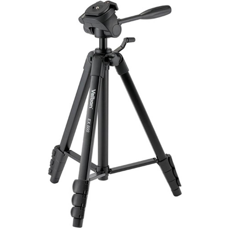 The EX-888 Aluminum Tripod with 3-Way Pan and Tilt Head from Velbon is a 2.8 lb aluminum support that has a load capacity of 3.3 lb. The head itself has friction control, which adds or decreases drag on the 360° rotation and also for the back-and-forth tilt. At a normal stance, the tripod has a height of 49.9″, but extending the legs 4-sections and geared center column, the tripod can reach a maximum height of 60.2″. With the legs fully splayed out, the center brace locks into place and provides extra stability. To transport the tripod, it folds down to 19.1″, and the support includes the QB-46 quick release plate.