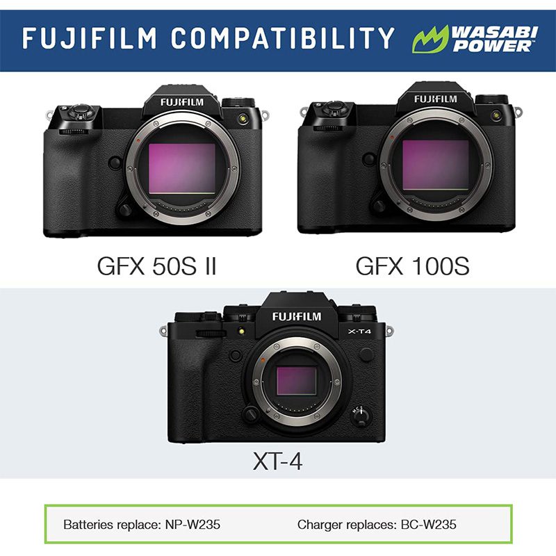 The Wasabi Power Battery (2-Pack) and Dual Charger for Fujifilm NP-W235 and Fuji X-T4 includes 2 batteries and one dual USB charger. Need a Fuji X-T4 battery for your X-T4 battery grip? A NP-W235 Wasabi Power battery is the perfect replacement for the Fujifilm NP-W235.
