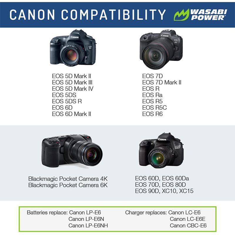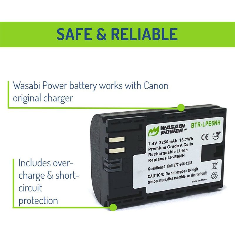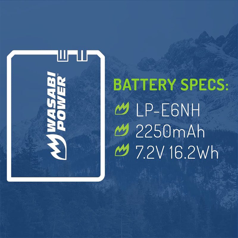 The Wasabi Power LP-E6NH battery replaces the Canon LP-E6NH battery pack. This battery features 2250mAh which provides a longer run-time between charges. It is made with Premium Grade-A cells to provide maximum battery life and also comes with a 3-year manufacturer warranty. Additionally, the Wasabi Power LP-E6NH comes fully decoded, so it will display the remaining battery life and usage time as well as faster shutter speeds and is compatible with the listed Canon cameras and chargers. Need a Canon LP-E6NH battery pack? Grab a Wasabi Power LPE6NH battery for your Canon EOS R today!